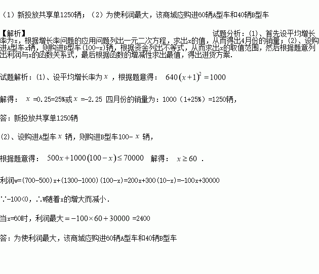 (1)若1月份到4月份新投放单车数量的月平均增长率相同,3月份新投放共享单车1000辆.请问该公司4月份在深圳市新投放共享单车多少辆?