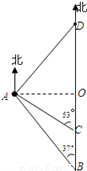 如图,一艘货船以每小时48海里的速度从港口B出发,沿正北方向航行.在港口B处时,测得灯塔A处在B处的北偏西37°方向上,航行至C处,测得A处在C处的北偏西53°方向上,且A、C之间的距离是45海里.在货船航行的过程中,求货船与灯塔A之间的最短距离及B、C之间的距离;若货船从港口B出发2小时后到达D,求A、D之间的距离.