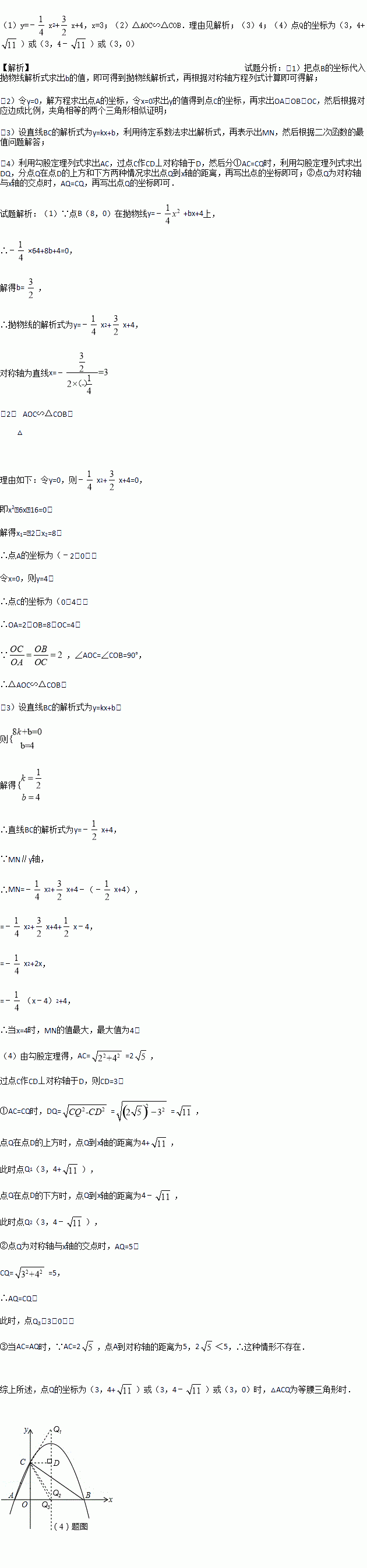 (4)在抛物线的对称轴上是否存在点Q,使△ACQ为等腰三角形?若存在,求出符合条件的Q点坐标;若不存在,请说明理由.