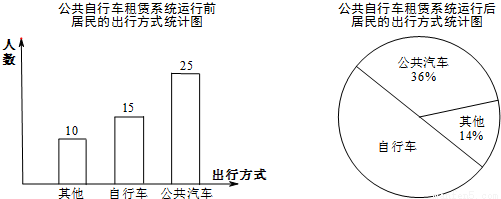 (2)公共自行车租赁系统运行后,被调查居民选择自行车作为出行方式的百分比提高了多少?