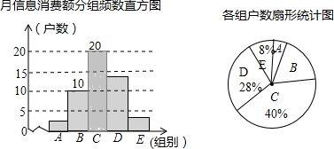 分析 (1)根据A、B两组户数直方图的高度比为1:5,即两组的频数的比是1:5,据此即可求得A组的频数;利用A和B两组的频数的和除以两组所占的百分比即可求得总数;