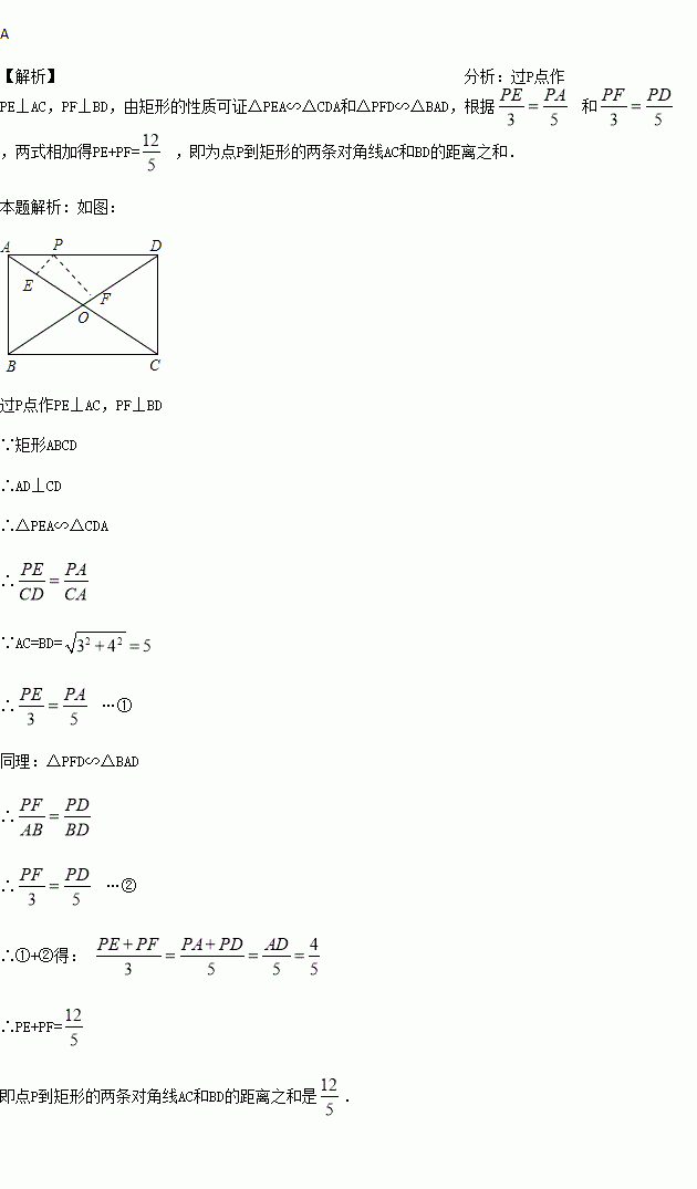 如图,点P是矩形ABCD的边AD上的一个动点,矩形的两条边AB、BC的长分别为3和4,那么点P到矩形的两条对角线AC和BD的距离之和是( )