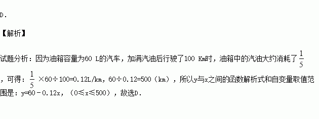 ,如果加满汽油后汽车行驶的路程为x Km,邮箱中剩油量为y L,则y与x之间的函数解析式和自变量取值范围分别是( )