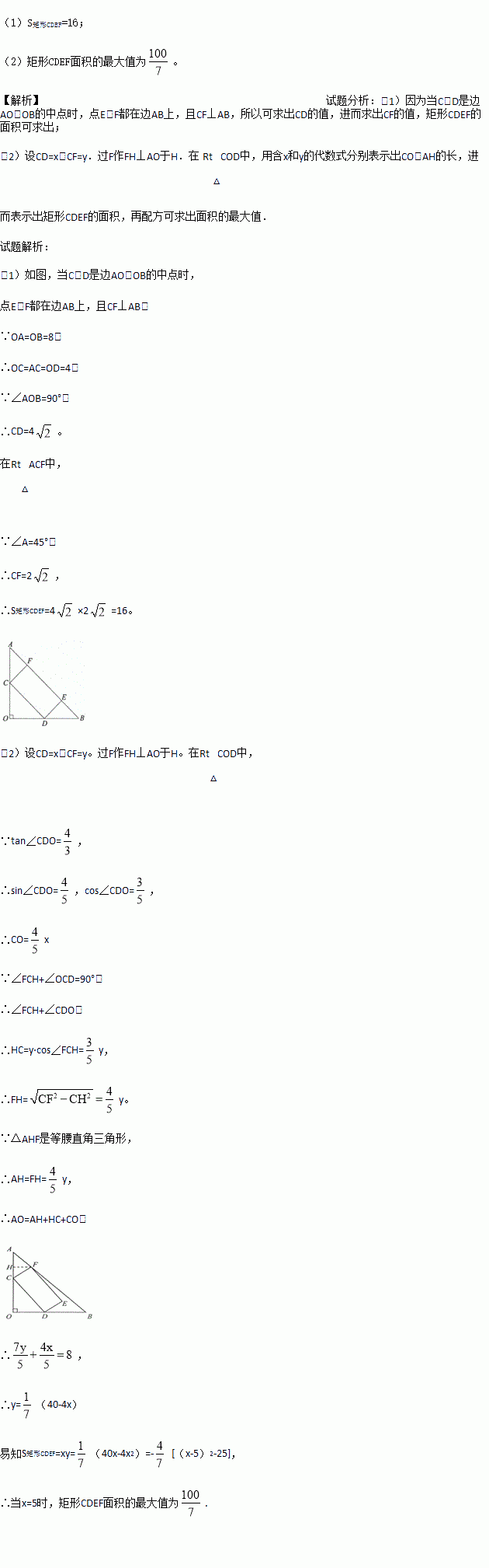 在△AOB中,OA=OB=8,∠AOB=90°,矩形CDEF的顶点C、D、F分别在边AO、OB、AB上。