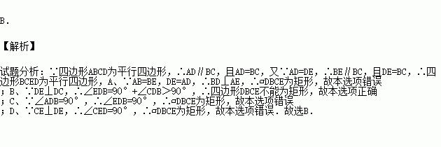 A.AB=BE B.BE⊥DC C.∠ADB=90° D.CE⊥DE