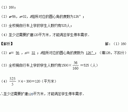 (4)该小组据此次调查结果向学校建议扩建学生车棚,若平均每4平方米能停放5辆自行车,请估计在现有300平方米车棚的基础上,至少还需要扩建多少平方米才能满足学生停车需求.