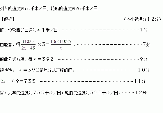 我国实施的“一带一路”战略方针,惠及沿途各国.中欧班列也已融入其中.从我国重庆开往德国的杜伊斯堡班列,全程约11025千米.同样的货物,若用轮船运输,水路路程是铁路路程的1.6倍,水路所用天数是铁路所用天数的3倍,列车平均日速(平均每日行驶的千米数)是轮船平均日速的2倍少49千米.分别求出列车及轮船的平均日速.