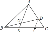 解答 解:作DF∥AE交BC于F,∵DF∥AE,G为BD的中点,∴BE=EF,∵DF∥AE,AD=2CD,∴EF=2FC,∴BE:EC=2:3.
