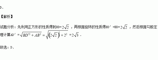 如图,已知正方形ABCD的边长为2,如果将线段BD绕着点B旋转后,点D落在CB的延长线上的D′处,那么AD′为( ).