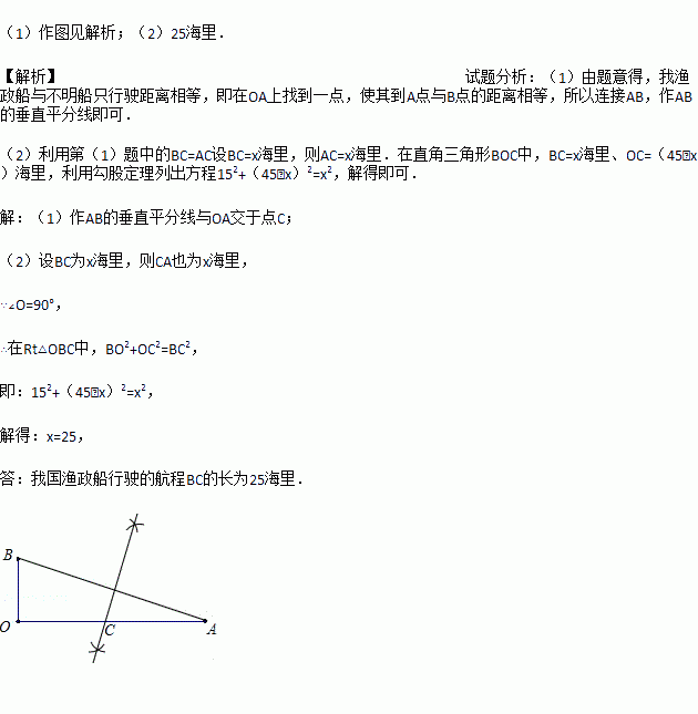 中日钓鱼岛争端持续,我海监船加大钓鱼岛海域的巡航维权力度.如图,OA⊥OB,OA=45海里,OB=15海里,钓鱼岛位于O点,我国海监船在点B处发现有一不明国籍的渔船,自A点出发沿着AO方向匀速驶向钓鱼岛所在地点O,我国海监船立即从B处出发以相同的速度沿某直线去拦截这艘渔船,结果在点C处截住了渔船.