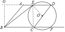 分析 (1)作BG⊥AD于G,连接CE,根据圆周角定理得出∠CED=90°,即CE⊥AD,进而证得四边形BCEG是矩形,得出GE=BC=4,解直角三角形求得BE=6,然后根据勾股定理求得BG,根据四边形的面积公式即可求得菱形的面积;