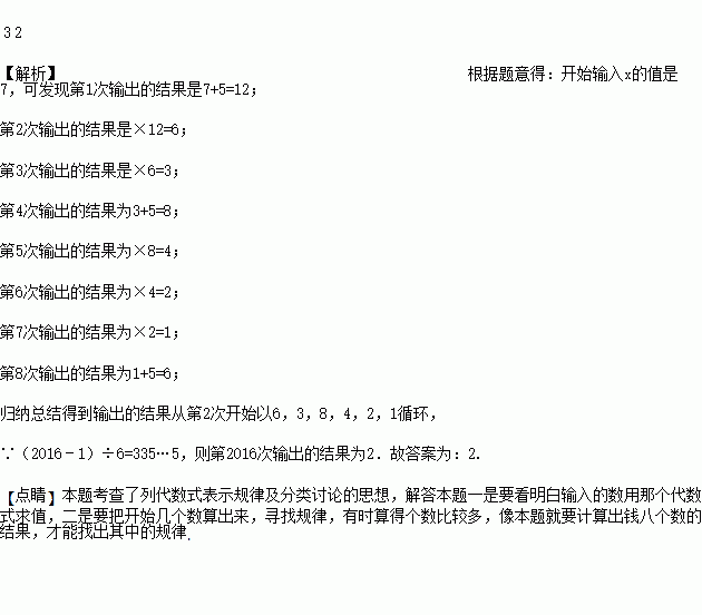 有一数值转换器,原理如图所示,若开始输入x的值是7,可发现第1次输出的结果是12,第2次输出的结果是6,第3次输出的结果是____,依次继续下去…,第2016次输出的结果是____.