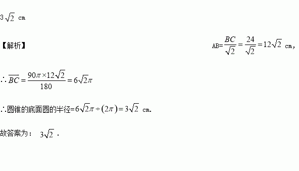 如图,从一块直径为24cm的圆形纸片上剪出一个圆心角为90°的扇形ABC,使点A,B,C在圆周上,将剪下的扇形作为一个圆锥的侧面,则这个圆锥的底面圆的半径是 ____________