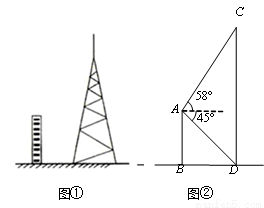 图①为平地上一幢建筑物与铁塔图,图②为其示意图.建筑物AB与铁塔CD都垂直于地面,BD=20m,