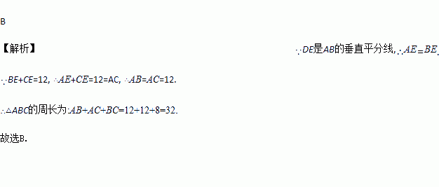 已知:如图,在△ABC中,AB=AC,DE是AB的垂直平分线,若BE+CE=12,BC=8,则△ABC的周长为( )
