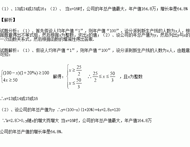 (2)当多少人参加新生产线生产时,公司年总产值最大?相比分工前,公司年总产值的增长率是多少?