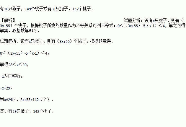 有一群猴子,一天结伴去偷桃子,在分桃子时,如果每个猴子分了3个,那么还剩55个;如果每一个猴子分5个,都能分得桃子,但剩下一个猴子分得的桃子不够4个,你能求出有几只猴子,几个桃子吗?