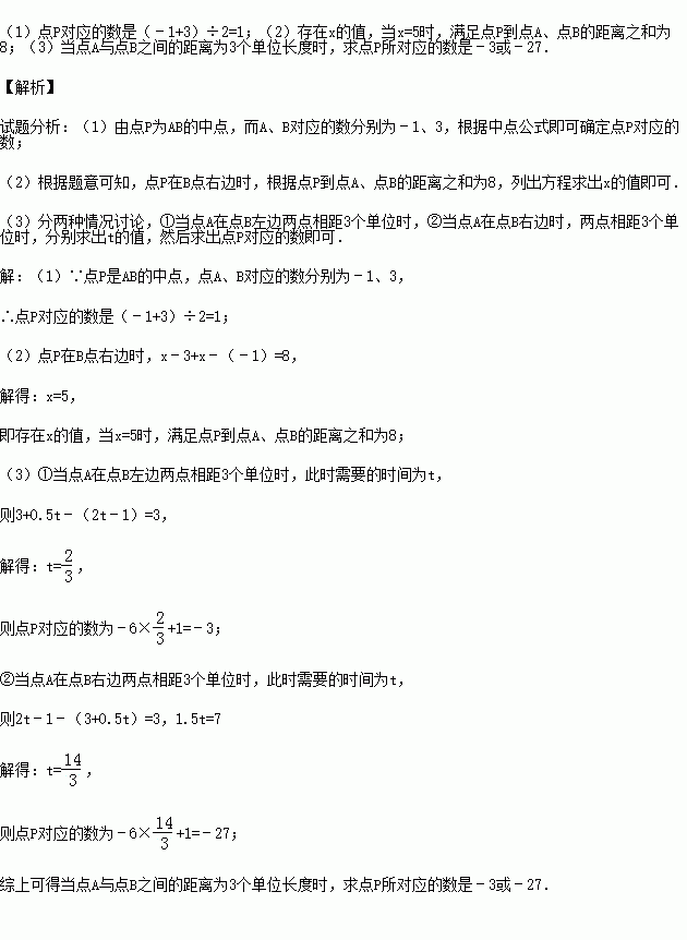 (3)现在点A、点B分别以每秒2个单位长度和每秒0.5个单位长度的速度同时向右运动,同时点P以每秒6个单位长度的速度从表示数1的点向左运动.当点A与点B之间的距离为3个单位长度时,求点P所对应的数是多少?