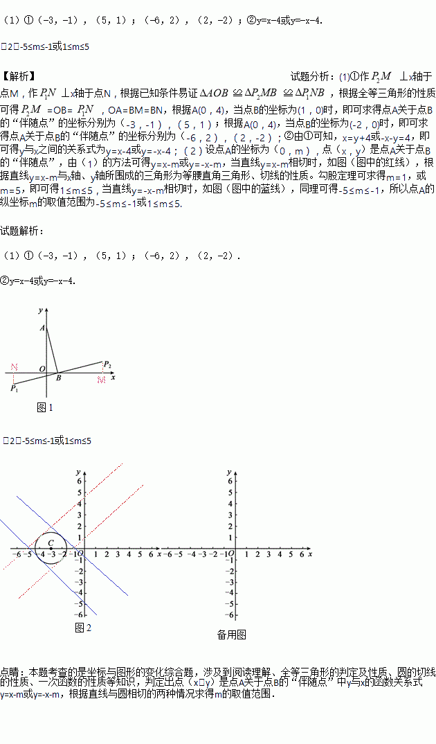 在平面直角坐标系xOy中,点A的坐标为(0,m),且m≠0,点B的坐标为(n,0),将线段AB绕点B旋转90°,分别得到线段B P1,B P2,称点P1,P2为点A关于点B的“伴随点”,图1为点A关于点B的“伴随点”的示意图.
