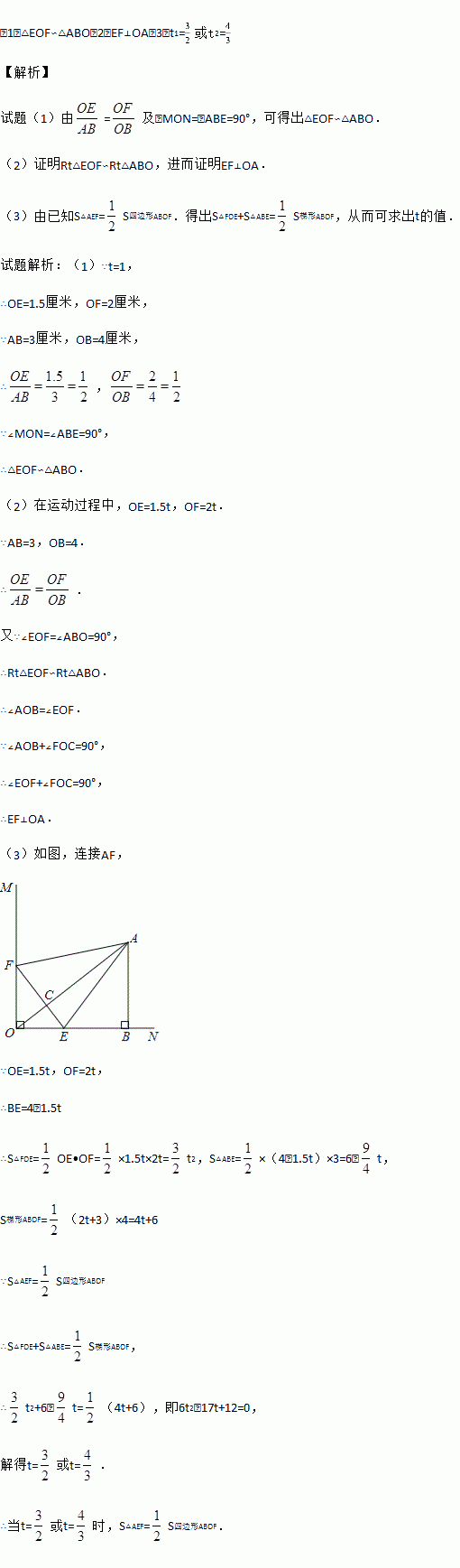 如图,已知∠MON=90º,A是∠MON内部的一点,过点A作AB⊥ON,垂点为点B,AB=3厘米,OB=4厘米,动点E、F同时从O点出发,点E以1.5厘米/秒的速度沿ON方向运动,点F以2厘米/秒的速度沿OM方向运动,EF与OA交于点C,连接AE,当点E到达点B时,点F随之停止运动。设运动时间为t秒(t>0)。