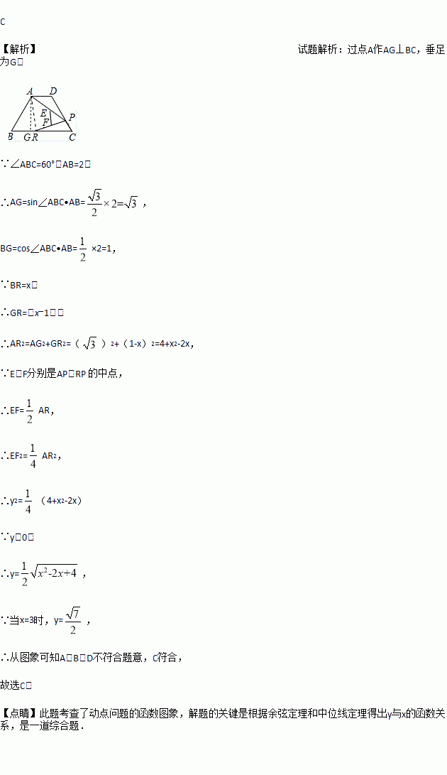 如图,在梯形ABCD中,AD∥BC,∠ABC=60º,AB=DC=2,AD=1,R、P分别是BC、CD边上的动点(点R、B不重合,点P、C不重合),E、F分别是AP、RP的中点,设BR=x,EF=y,则下列图象中,能表示y与x的函数关系的图象大致是