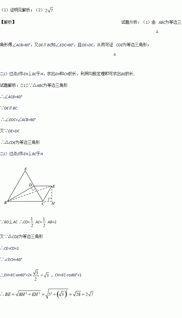 如图,△ABC为等边三角形,过点B作BD⊥AC于点D,过D作DE∥BC,且DE=CD,连接CE,
