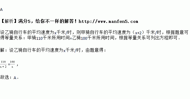 甲、乙两人同时分别从A,B两地沿同一条公路骑自行车到C地.已知A,C两地间的距离为110千米,B,C两地间的距离为100千米.甲骑自行车的平均速度比乙快2千米/时.结果两人同时到达C地.求两人的平均速度,为解决此问题,设乙骑自行车的平均速度为x千米/时.由题意列出方程.其中正确的是( )