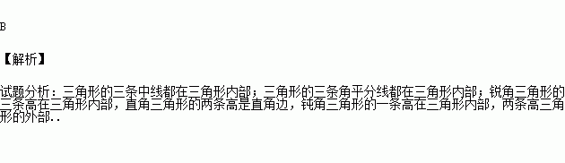 ①三角形的三条中线都在三角形内部;②三角形的三条角平分线都在三角形内部;③三角形三条高都在三角形的内部.