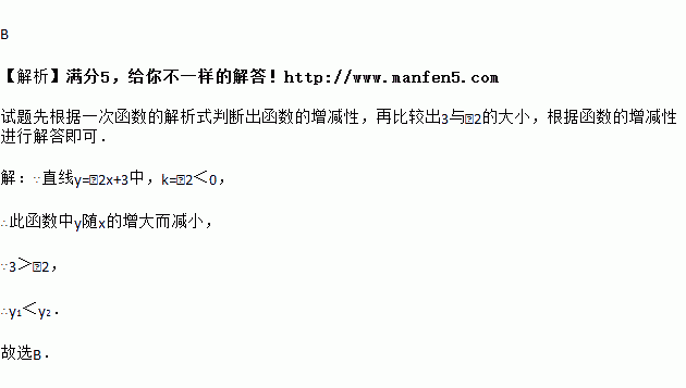 点A(3,y1,),B(-2,y2)都在直线y=-2x+3上,则y1与y2的大小关系是( )