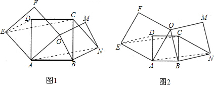 分析:(1)AE=CN,AE∥CN,理由为:连接ED,EC,AN,如图1所示,由正方形ABCD、AOFE,得到一对角为直角,两对边相等,利用同角的余角相等,利用SAS得出三角形AED与三角形AOB全等,由全等三角形对应边相等得到DE=BO,AE=CN,再由BN=BO,等量代换得到DE=BN,同理得到三角形EDC与三角形ABN全等,利用全等三角形的对应边相等得到EC=AN,利用两对对应边相等的四边形为平行四边形得到AECN为平行四边形,利用平行四边形的对应边平行且相等即可得证;