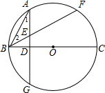(2)根据垂径定理得$\widehat{AB}$=$\widehat{BC}$,而$\widehat{AB}$=$\widehat{AF}$,则$\widehat{BG}$=$\widehat{AF}$,所以根据圆周角定理得∠1=∠2,然后根据等腰三角形的判定即可得到结论.