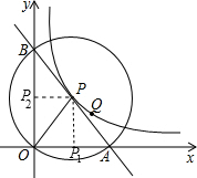 分析:由P在⊙O上,而∠AOB=90°,根据圆周角定义的推论得AB是⊙P的直径,即可得到点P在线段AB上;过点P作PP1⊥x轴,PP2⊥y轴,设P(a,b),由P点为圆心可得PP1、PP2是△AOB的中位线,则S△AOB=OA×OB=×2PP1×2PP2=2ab,再根据P点在反比例函数y=(x>0)图象上的点得到ab=6,把ab=6代入即可得到△AOB的面积.