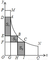 六•一儿童节,小文到公园游玩.看到公园的一段人行弯道MN(不计宽度),如图,它与两面互相垂直的围墙OP、OQ之间有一块空地MPOQN(MP⊥OP,NQ⊥OQ),他发现弯道MN上任一点到两边围墙的垂线段与围墙所围成的矩形的面积都相等,比如:A、B、C是弯道MN上的三点,矩形ADOG、矩形BEOH、矩形CFOI的面积相等.爱好数学的他建立了平面直角坐标系(如图),图中三块阴影部分的面积分别记为S1、S2、S3,并测得S2=6(单位:平方米).OG=GH=HI.