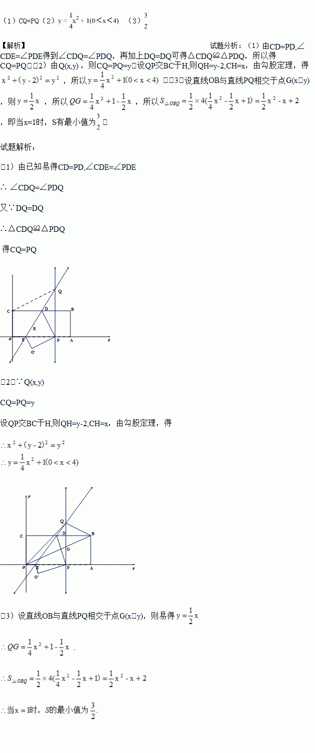 如图所示,将矩形OABC置于平面直角坐标系中,点A,C分别在x,y轴的正半轴上,已知点B(4,2),将矩形OABC翻折,使得点C的对应点P恰好落在线段OA(包括端点O,A)上,折痕所在直线分别交BC、OA于点D、E;若点P在线段OA上运动时,过点P作OA的垂线交折痕所在直线于点Q.