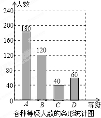 分析 ①利用扇形统计图中各百分比的和为1可求出x=30,再计算出B和C等级的人数,然后补全条形统计图;