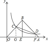 分析 作BE⊥OA于E,DF⊥OA于F,CG⊥OA于G,根据等腰直角三角形的性质OE=AE=BE=2,进而求得BC=OC=$\sqrt{2}$,从而求得OG=CG=1,得出C(1,1),利用待定系数法求得双曲线的解析式为y=$\frac{1}{x}$,设D(a,$\frac{1}{a}$),则AF=4-a,DF=$\frac{1}{a}$,根据△ADF∽△ABE,对应边成比例求得AD=2$\sqrt{2}$-$\sqrt{6}$,从而求得BD=$\sqrt{6}$,然后根据正切函数即可求得∠BDC的度数.