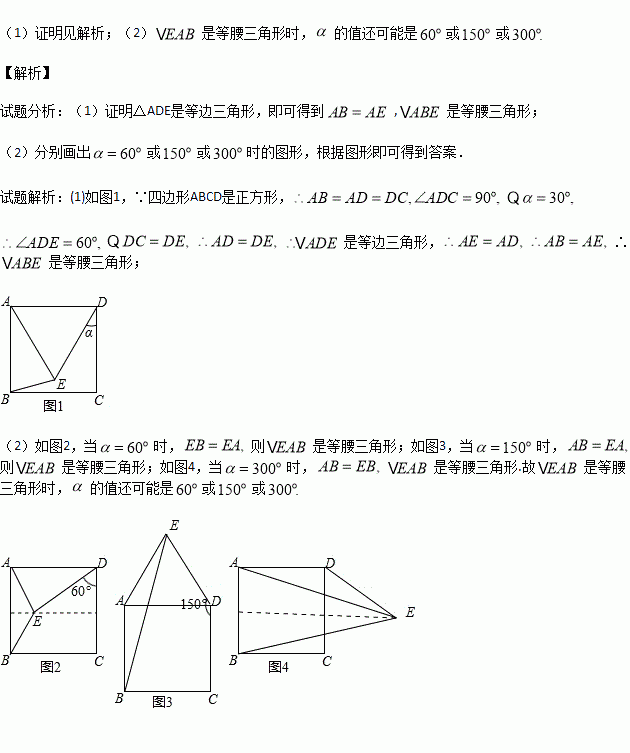 如图,以点D为中线把正方形ABCD的边DC顺时针旋转α度(0<α<360°)得DE,连接AE、BE.