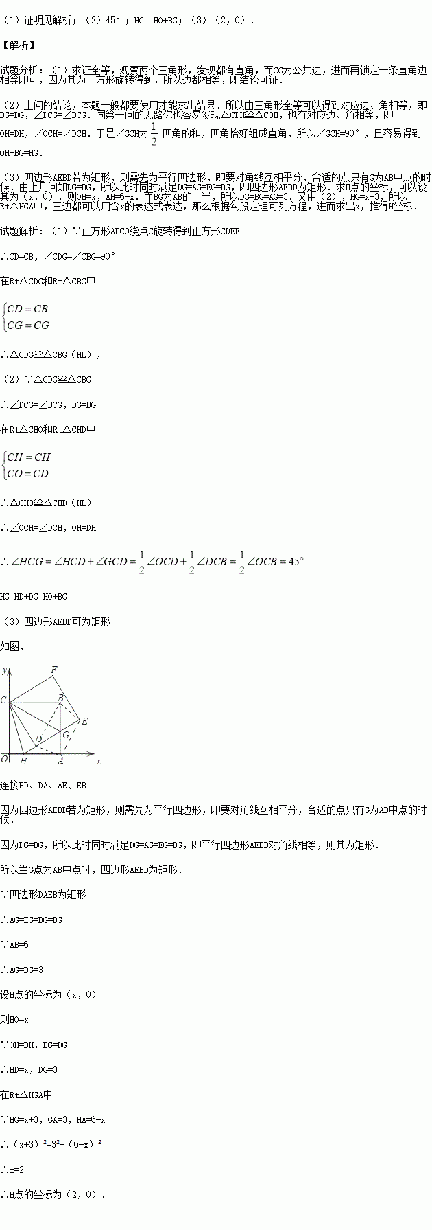 (2)求∠HCG的度数;并判断线段HG、OH、BG之间的数量关系,说明理由;