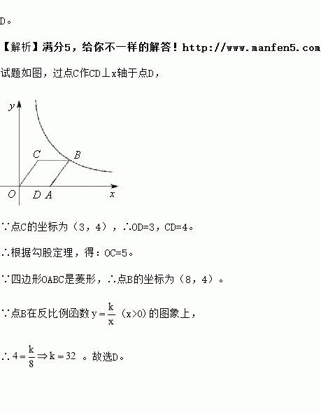 如图,菱形OABC的顶点C的坐标为(3,4),顶点A在x轴的正半轴上.反比例函数