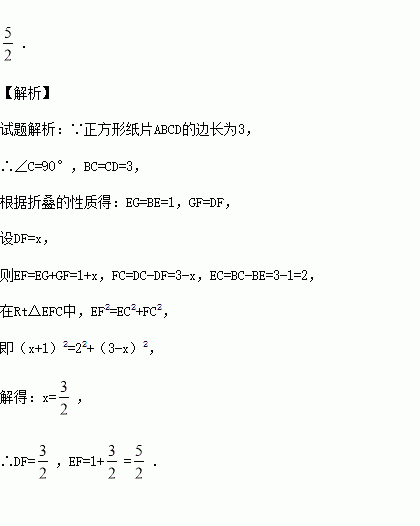如图,正方形纸片ABCD的边长为3,点E、F分别在边BC、CD上,将AB、AD分别沿AE、AF折叠,点B、D恰好都落在点G处,已知BE=1,则EF的长为 .