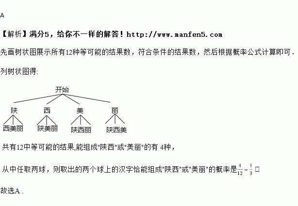 一个不透明的口袋里装有分别标有汉字“陕”、“西”、“美”、“丽”的4个小球,除汉字不同之外,小球没有任何区别,小航从中任取两球,则取出的两个球上的汉字恰能组成“陕西”或“美丽”的概率是( )