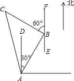 解:如图,由题意得∠DAB=30°,∠FBC=60°,AB=BC=l00米.