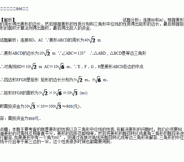 四边形花坛EFGH,其四个顶点恰好在菱形ABCD各边的中点,现在准备在花坛中种植茉莉花,其单价为10元/m2,请问需投资金多少元?(结果保留整数)