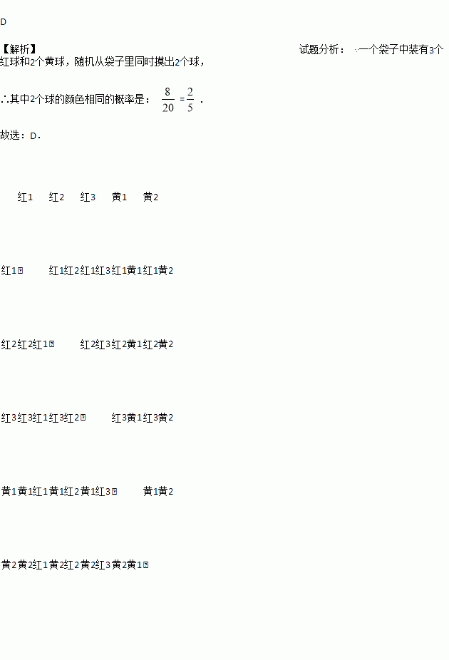 一个袋子中装有3个红球和2个黄球,这些球的形状、大小.质地完全相同,在看不到球的条件下,随机从袋子里同时摸出2个球,其中2个球的颜色相同的概率是( )