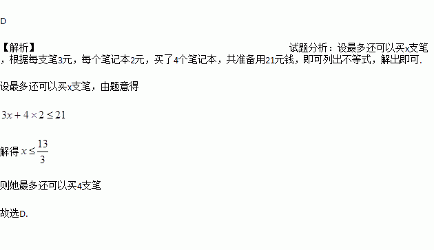 小颖准备用21元钱买笔和笔记本. 已知每支笔3元,每个笔记本2元,她买了4个笔记本,则她最多还可以买( )支笔.