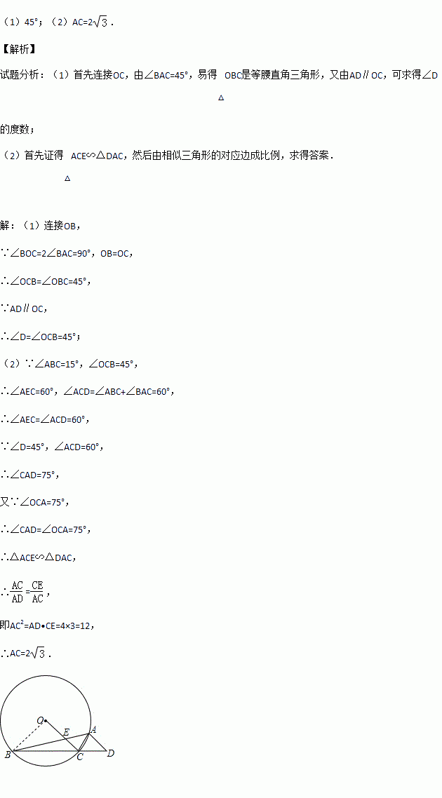 如图所示,⊙O的内接△ABC中,∠BAC=45°,∠ABC=15°,AD∥OC并交BC的延长线于D点,OC交AB于E点.
