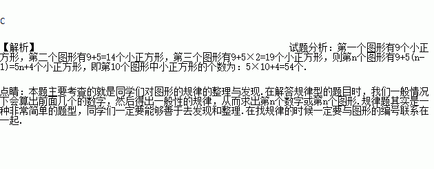 下列图形都是由边长为“1”的小正方形按一定规律组成,其中第1个图形有9个边长为1的小正方形,第2个图形有14个边长为1的小正方形……则第10个图形中边长为1的小正方形的个数为( )