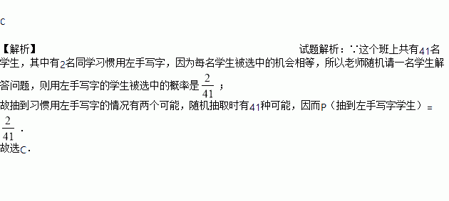 某班共有41名同学,其中有2名同学习惯用左手写字,其余同学都习惯用右手写字,老师随机请1名同学解答问题,习惯用左手写字的同学被选中的概率是( )