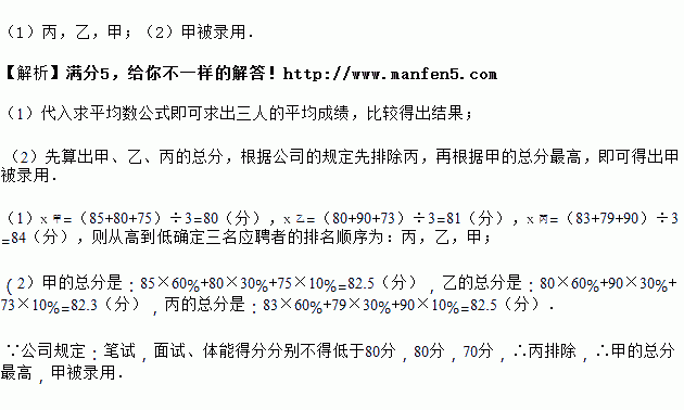 (2)该公司规定:笔试,面试、体能得分分别不得低于80分,80分,70分,并按60%,30%,10%的比例计入总分(不计其他因素条件),请你说明谁将被录用.