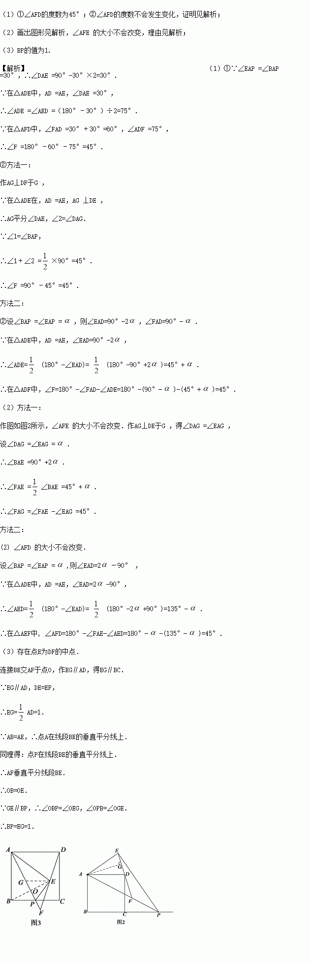 (2)如图2,若点P在BC边的延长线上时,∠AFD的度数是否会发生变化?试在图中画出图形,并直接写出结论;